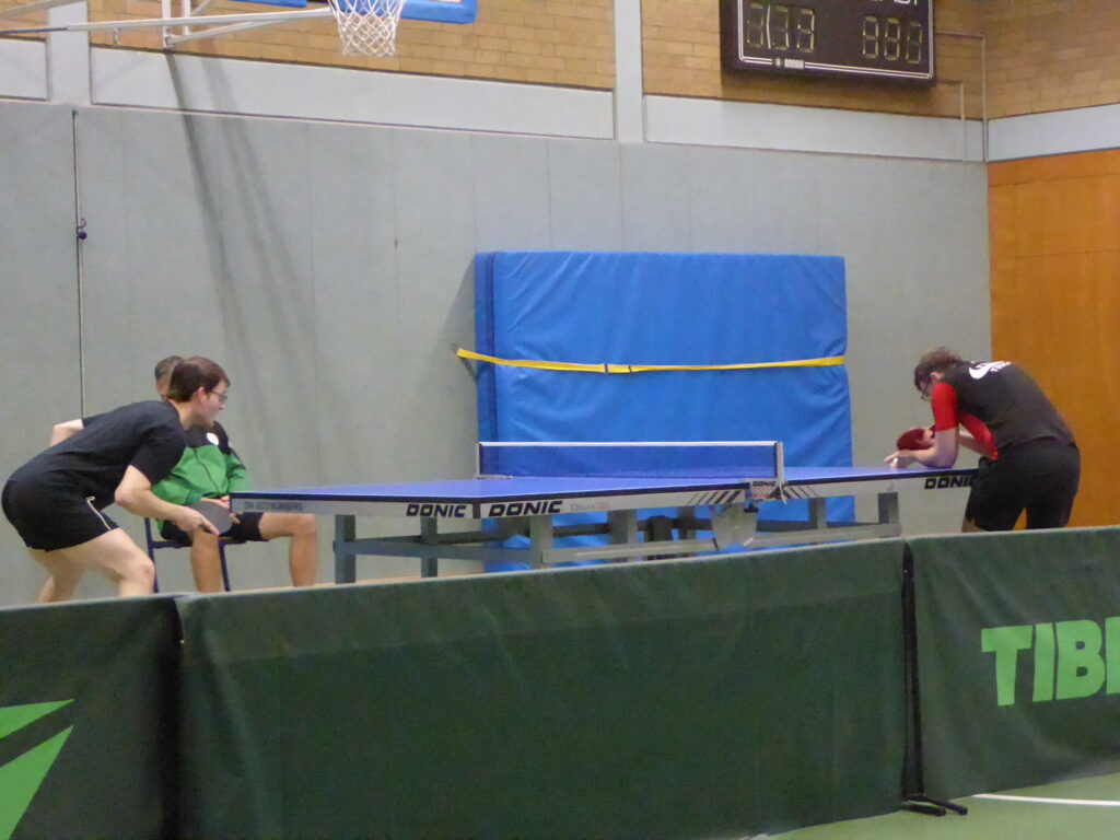 Das Match zwischen Julius Waßmann, dem Topspieler der Liga (27:1 Siege) und Jannik dauerte zum Glück für Tom nicht allzu lange 🙂 Während der ersten zwei Sätze hatte man den Eindruck Jannik spielt gegen einen Trainingsroboter. Er sah immer nur ein weißes Flugobjekt auf ihn zukommen, welches dann rechts oder links von ihm einschlug (11:4, 11:2).