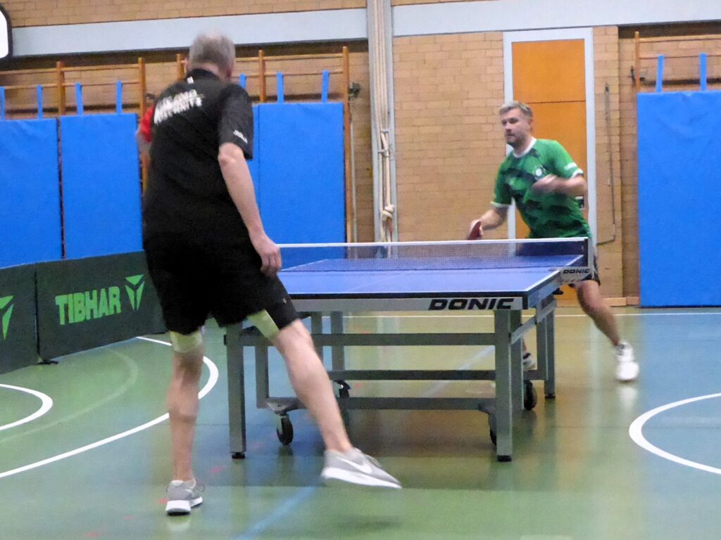 Das Match des Abends, was die Spannung und spektakulären Ballwechsel angeht, gab es aber wenig später zwischen Michael Waßmann und Tom. Die zwei „fast sechziger“..okay Michael ist ein Jahr jünger 🙂 zeigten eindrucksvoll, dass sie noch lange nicht auf den Wertstoffhof gehören 🙂 Wir springen gleich in den fünften Satz, welcher an Dramatik nicht mehr zu überbieten war. Michael hatte zunächst alles im Griff und führte mit 7:3. Tom kämpfte sich zurück und ging selbst mit 8:7 in front. Jetzt ging es hin und her, beide hatten mehrere Matchbälle , welche vom jeweils anderen teils spektakulär abgewehrt wurden. Beide gingen „all in“ und spielten alles andere als Angsthasen-Tischtennis. Einen normal nicht mehr zu erreichenden Schmetterball von Tom schoss Michael sensationell zurück, woraufhin er zurecht von Tom einen Daumen hoch bekam. Kurz danach wehrte Tom einen perfekt plazierten Topspin von Michael mit der „Noppensäge“ ab. Das ging soweit, das Philipp und Silvio auf der Nebenplatte während der Ballwechsel mit einem Auge rüber schauten. Letztlich musste es leider einen Sieger geben, welcher zum Leidwesen von Tom Michael war (16:14).